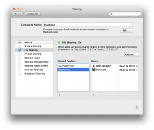 Adjust the permissions for each account (if you would like anyone to access, make sure everyone has Read & Write access). The path will be displayed above, but we will need to add some information to the end to successfully add the folder to Media Center. If you are going to use SMB over AFP, make sure to hit options and allow the user accounts. When you type in the path, you will be prompted to type in the user name and password.